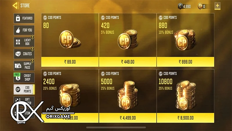 هر بسته بر اساس منطقه و پلتفرم، قیمت متفاوتی دارد و گزینههایی از مقدار کم تا زیاد در دسترس است. با خرید مستقیم CP، می توانید فورا از آن برای خرید اسکین ها، بتل پس یا آیتم های ویژه استفاده کنید. اگر خرید مستقیم درون گیمی برای شما به دلیل محدودیت های مالی وجود ندارد، می توانید سی پی کالاف دیوتی موبایل مورد نیاز خود را به روشی مطمئن و امن از فروشگاه مطمئن اوریکس گیم تهیه نمایید.